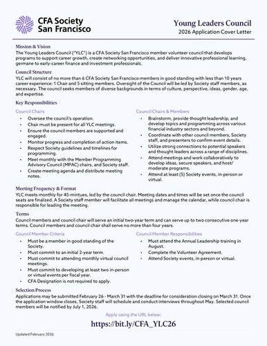 We encourage members who are motivated to build community, champion new ideas, and elevate the early-career experience to apply. The Council values diverse perspectives and seeks individuals who reflect the breadth of backgrounds, experiences, and expertise across the investment profession.